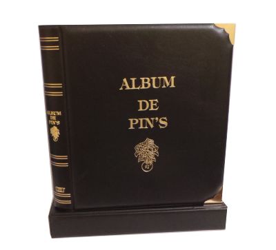 Album para PINS. Tamaño 27x33cm (Folio). 4 Anillas 80/80/80. Fabircado en polipiel espumado bitono.Marcas y Logos en oro inalterable por alta frecuencia. Sin Cajetín. Color: Negro. Incluye 5 hojas granates