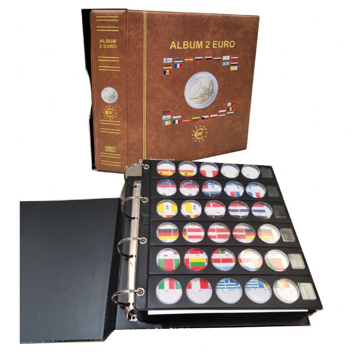 Album MAMUT con cajetín. Gran capacidad. 4 Anillas D 45mm. Impreso a todo color.INCLUYE 5 Hojas BURBUJAS para 150 monedas de 2 €uros