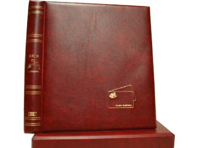 Album TARJETAS TELEFONICAS. Tamaño Mediano 26x23, 4 Anillas Standard 80/80/80. Fabricado en polipiel bitono espumado de alta calidad. Marcas y Logos en oro inalterable por alta frecuencia. INCLUYE funda cajetín también en polipiel idéntica al álbum; lo que le confiere una gran prestancia y calidad. Tamaño: 26x23cm. Color: Granate.