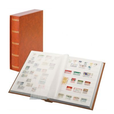 STOCK BOOK ELEGANT BEIGE, CON 60 PÁGINAS BLANCAS Y ESTUCHE PROTECTOR A JUEGO.BEIGE. Datos del artículo Libro de existencias con funda de cuero sintético acolchado y caja protectora de cartón laminado a juego. 60 páginas blancas (30 hojas) con doble bisagra de lino, cada una con 10 tiras glassine e intercaladas dobles glassine. Formato: 240 x 320 mm. Rayas doradas en la tapa y la espalda. Más información El casete protector está cubierto con el mismo material de cubierta que el libro de existencias. Número de orden 1162SK-H Stock book ELEGANT negro, con 60 páginas blancas y estuche protector a juego